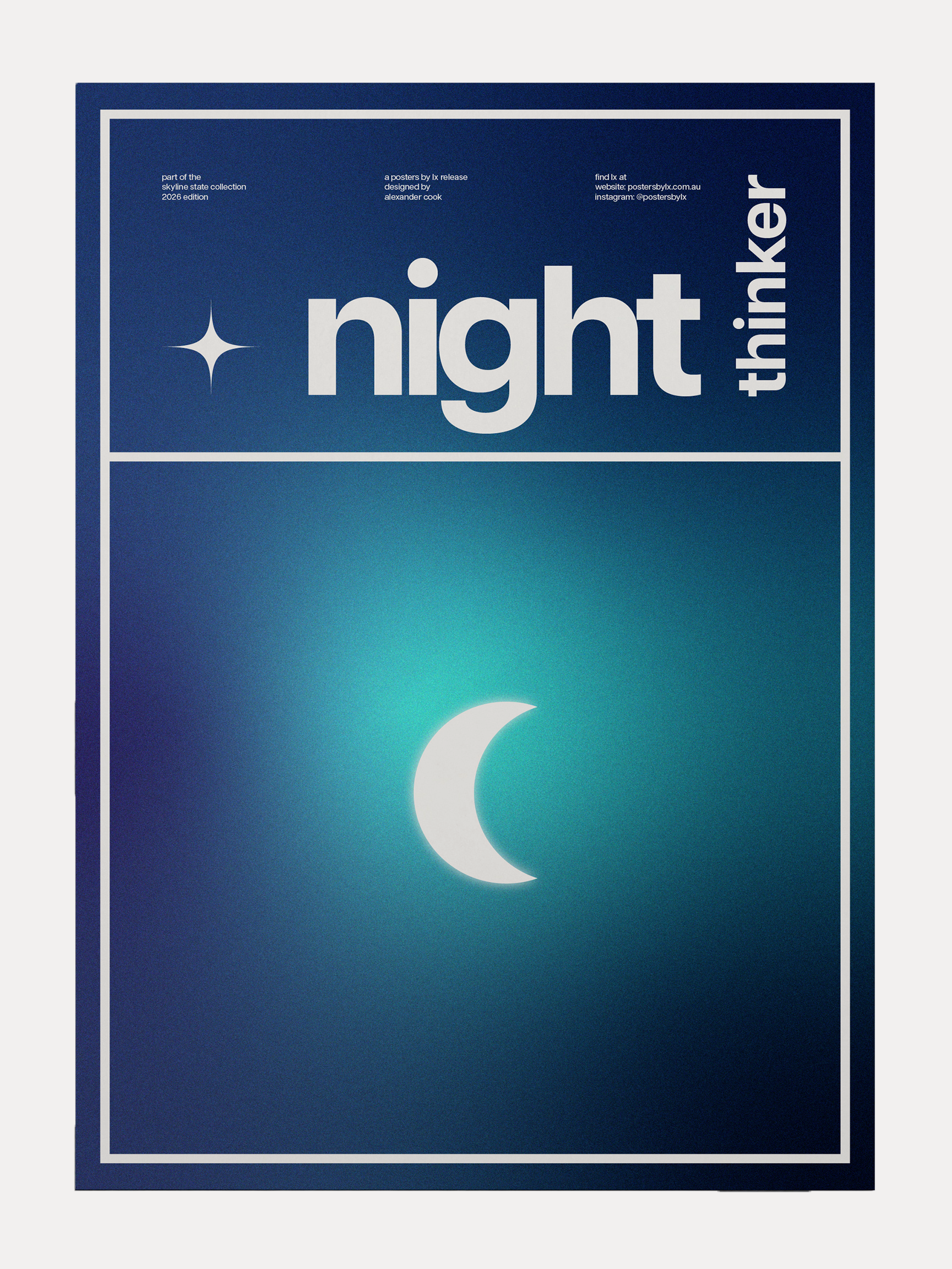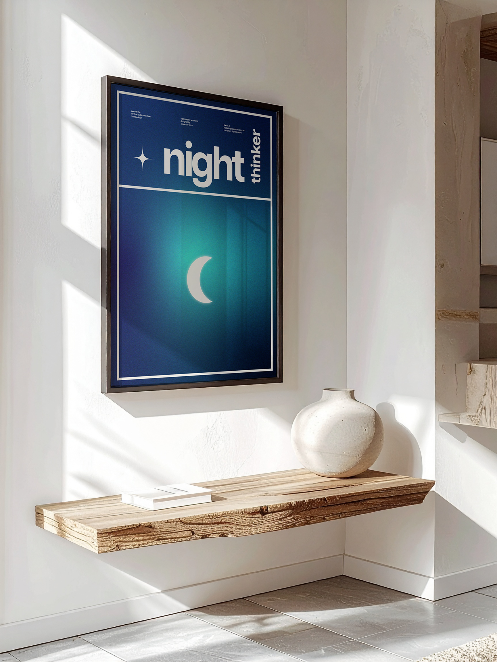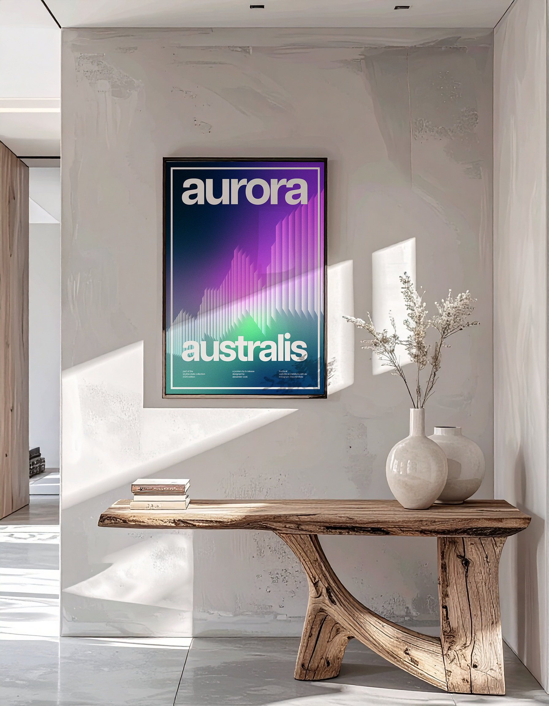 Aurora Australis captures the immense sense of awe and perspective I want to bring into my life. The chaotic, vibrant curtains of light, rendered in clean geometric forms, represent the world's untamed majesty and remind me of its sheer scale. While the "Sunset State of Mind" and "Night Thinker" pieces reflect internal states, the Aurora pushes me outward, challenging me to look beyond the immediate and find profound inspiration. This poster is a powerful visual jolt, confirming the beauty and vastness that fuel my creative drive and wonder.