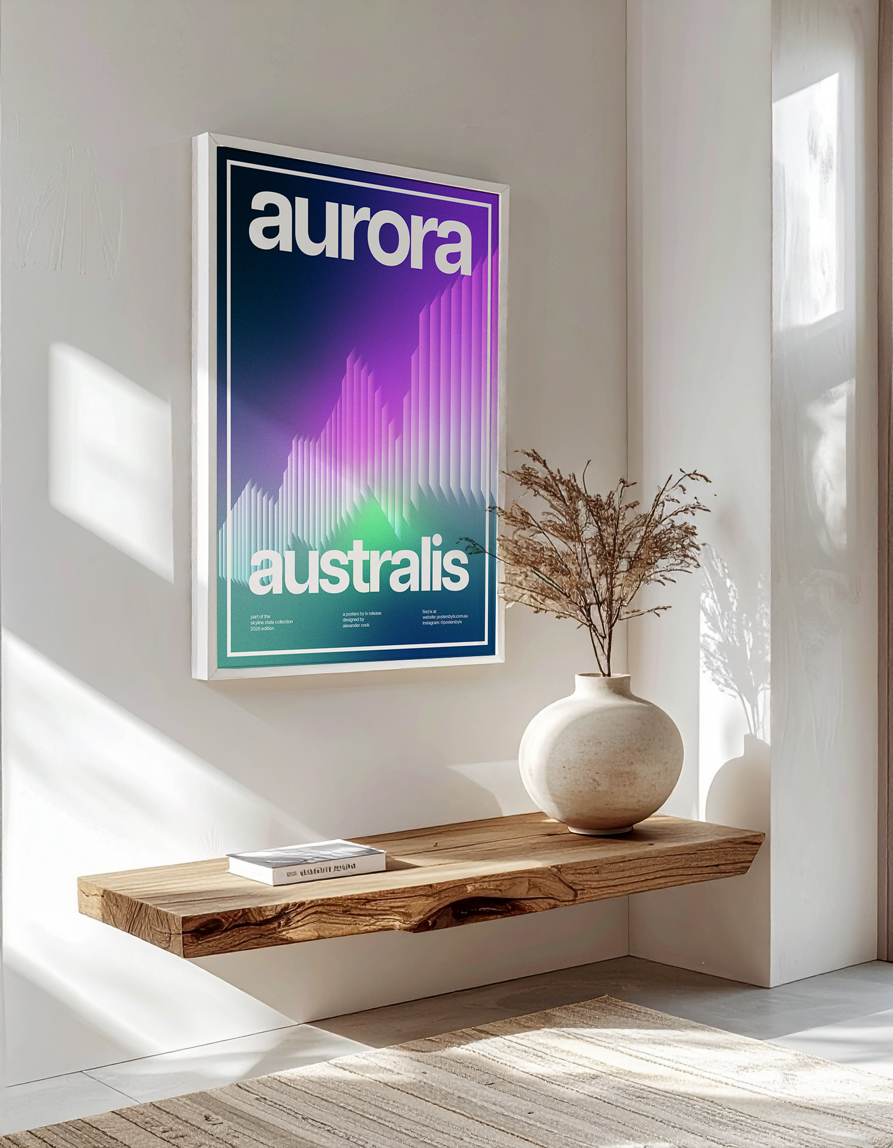 Aurora Australis captures the immense sense of awe and perspective I want to bring into my life. The chaotic, vibrant curtains of light, rendered in clean geometric forms, represent the world's untamed majesty and remind me of its sheer scale. While the "Sunset State of Mind" and "Night Thinker" pieces reflect internal states, the Aurora pushes me outward, challenging me to look beyond the immediate and find profound inspiration. This poster is a powerful visual jolt, confirming the beauty and vastness that fuel my creative drive and wonder.