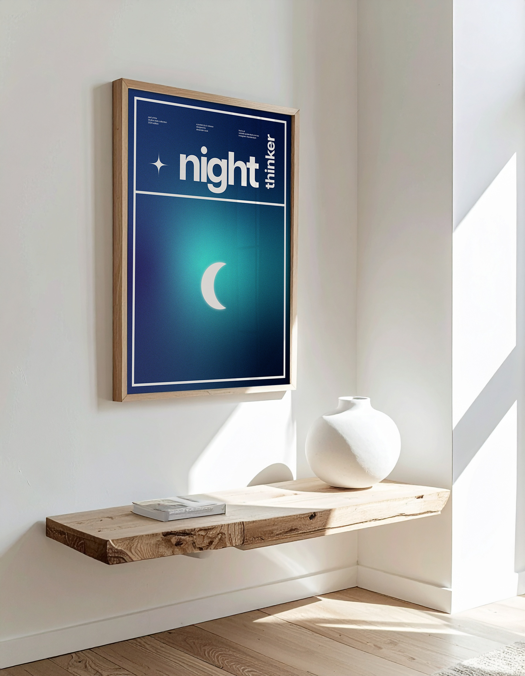 Night Thinker is a deeply personal piece that embodies the most productive time for my own thought process. It celebrates the period of clarity and reflection I find when I am alone in the quiet. The deep indigo and glowing teal set the atmosphere for those moments lying in bed when my mind is completely clear, allowing me to replay the day's events or map out future creative paths. The crescent moon anchors the scene, symbolising the structure and wisdom I find when I am focused and free from daily noise.
