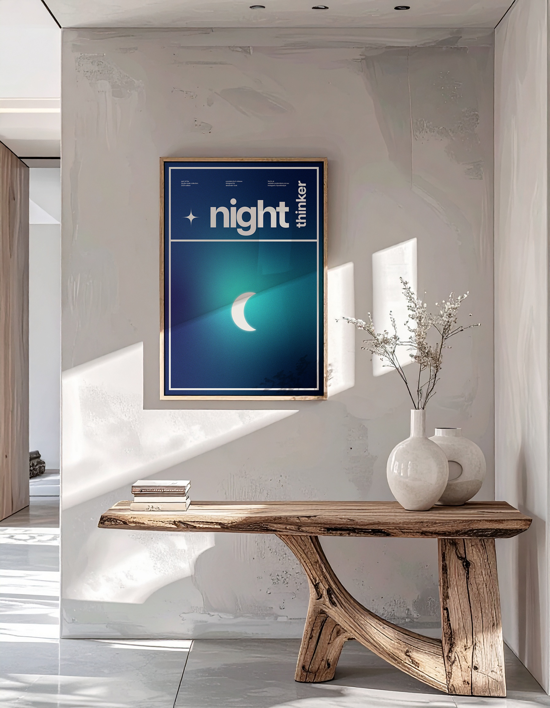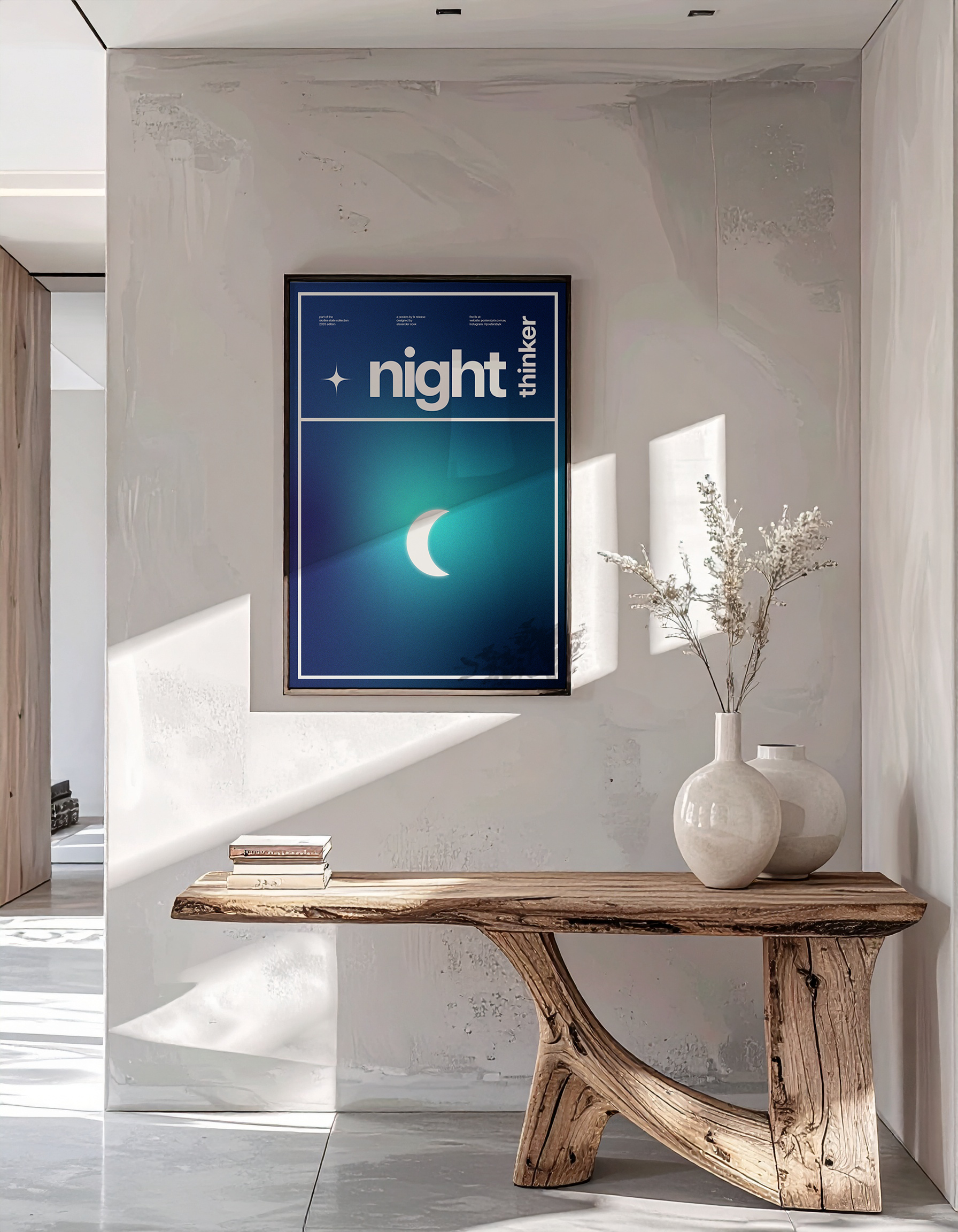 Night Thinker is a deeply personal piece that embodies the most productive time for my own thought process. It celebrates the period of clarity and reflection I find when I am alone in the quiet. The deep indigo and glowing teal set the atmosphere for those moments lying in bed when my mind is completely clear, allowing me to replay the day's events or map out future creative paths. The crescent moon anchors the scene, symbolising the structure and wisdom I find when I am focused and free from daily noise.