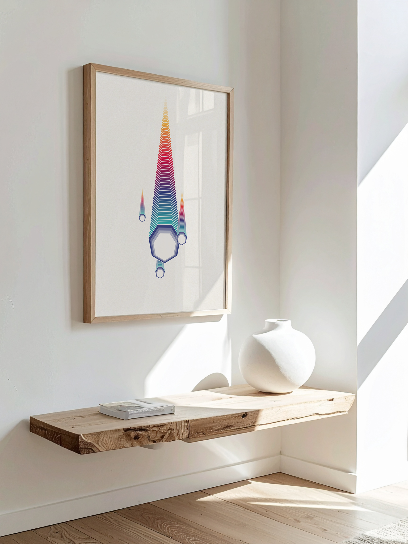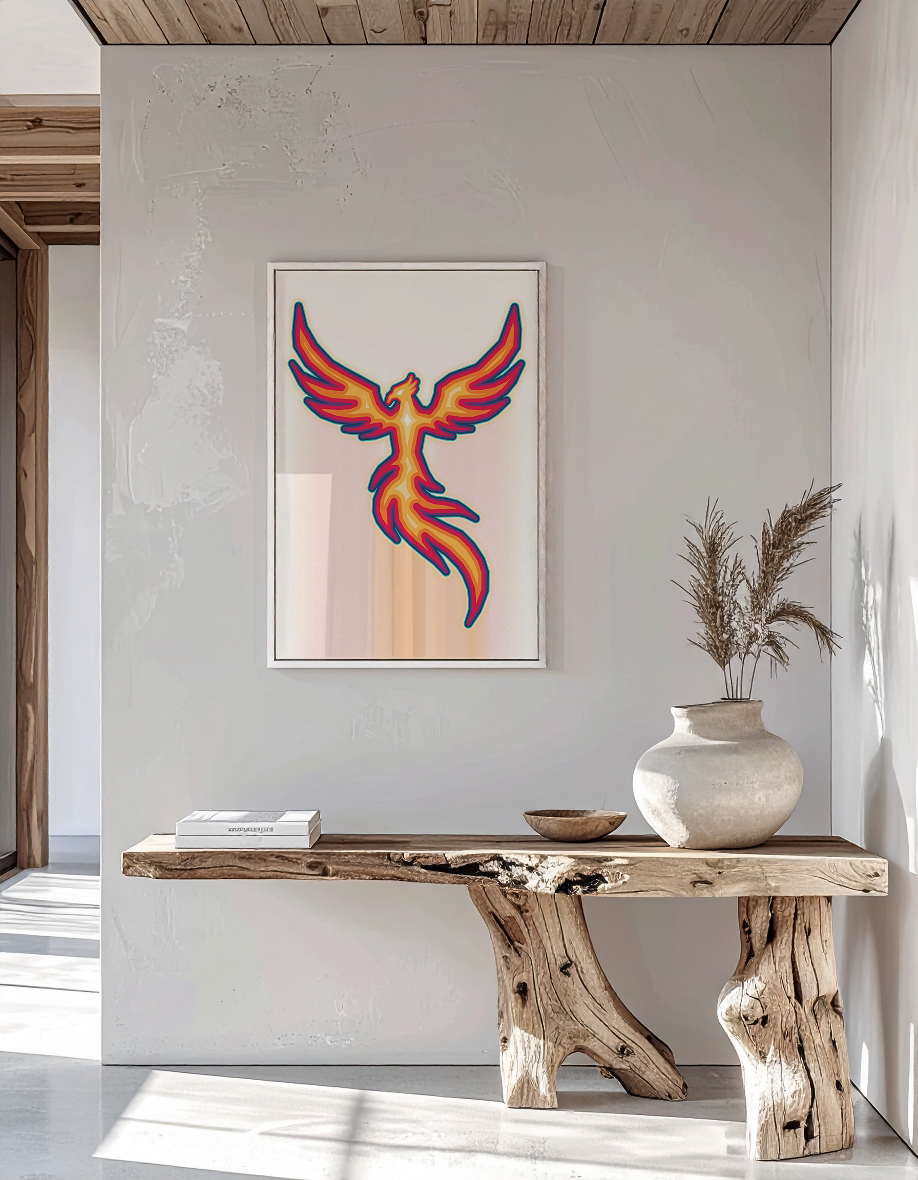 The final, triumphant statement of the collection. Phoenix Rex (Latin for "Phoenix King") presents the magnificent bird in its ultimate form - wings wide, radiating strength, and ready to thrive and succeed. This piece represents the artist fully reborn, embodying the energy, majesty, and unbridled potential that was dormant in the earlier, quieter stages. The bird's glowing core and powerful silhouette serve as a compelling visual promise: the cycle of Ascent to the Stars is complete, and a new, brilliant, and powerful creative era has begun.