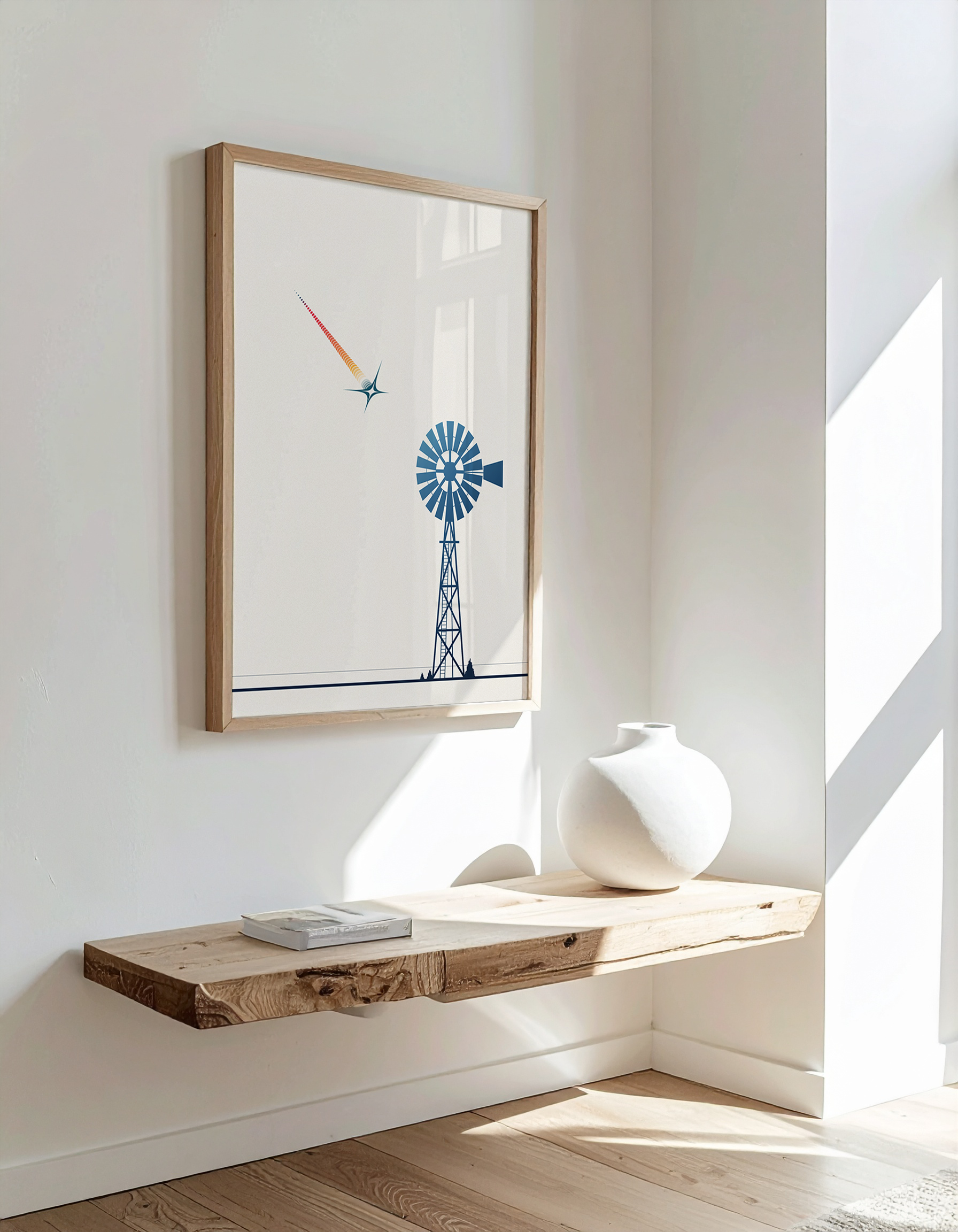 The story begins in a state of quiet, almost lonely, contemplation. Stillness (Before the Spark) captures the enduring, yet monotonous, rhythm of a past life - represented by the stalwart Outback Windmill, a symbol of hard work and the vast, unyielding Australian landscape. The monotony is disrupted by a comet-like celestial object, the first sign of impending change. This streak of fire is not destruction, but the Phoenix Egg descending, carrying the seed of a future transformation and hinting that a spectacular new life is about to be born out of the arid routine.