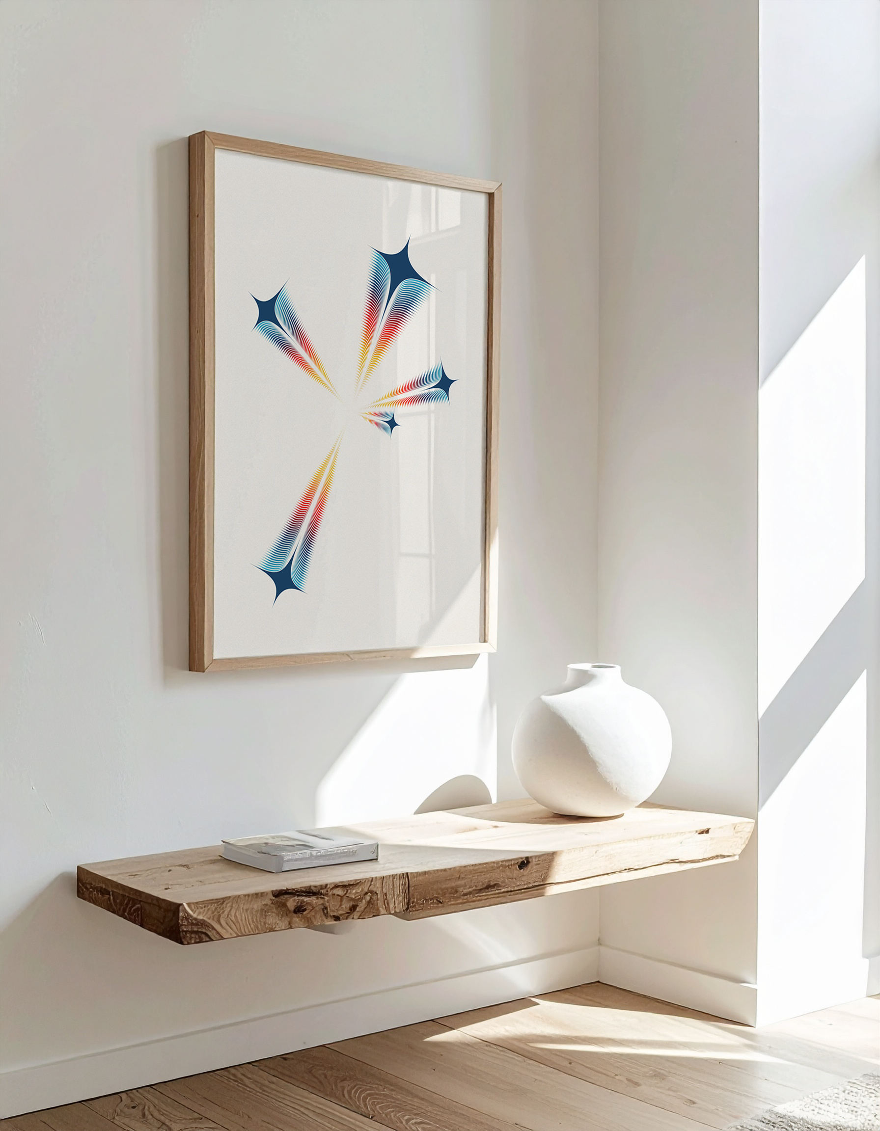 Change is no longer latent but explosive. The Burst of Destiny depicts the dramatic shattering of the Phoenix Egg, rendered through a dynamic abstraction of the Southern Cross constellation. This iconic symbol of the Southern Hemisphere and Australian nationality acts as a metaphor for the sheer, powerful eruption of energy and self-belief required to break free from the old. The stars are not just markers in the sky; they are brilliant shards of destiny, representing the moment the artist fully commits to the transformative new era.