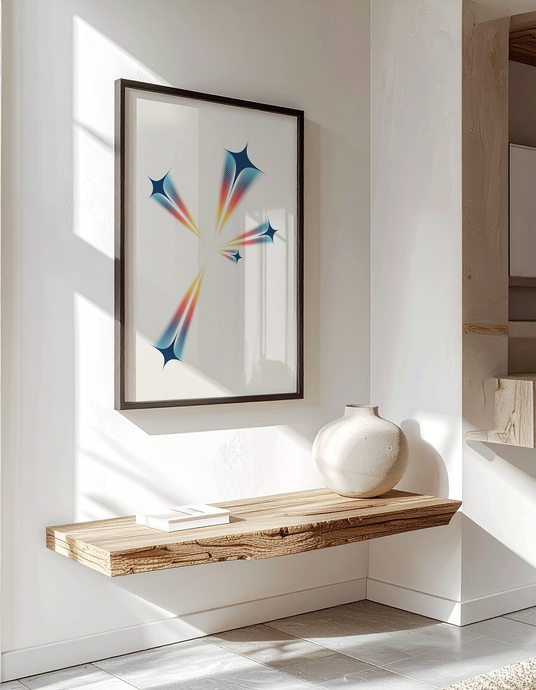 Change is no longer latent but explosive. The Burst of Destiny depicts the dramatic shattering of the Phoenix Egg, rendered through a dynamic abstraction of the Southern Cross constellation. This iconic symbol of the Southern Hemisphere and Australian nationality acts as a metaphor for the sheer, powerful eruption of energy and self-belief required to break free from the old. The stars are not just markers in the sky; they are brilliant shards of destiny, representing the moment the artist fully commits to the transformative new era.