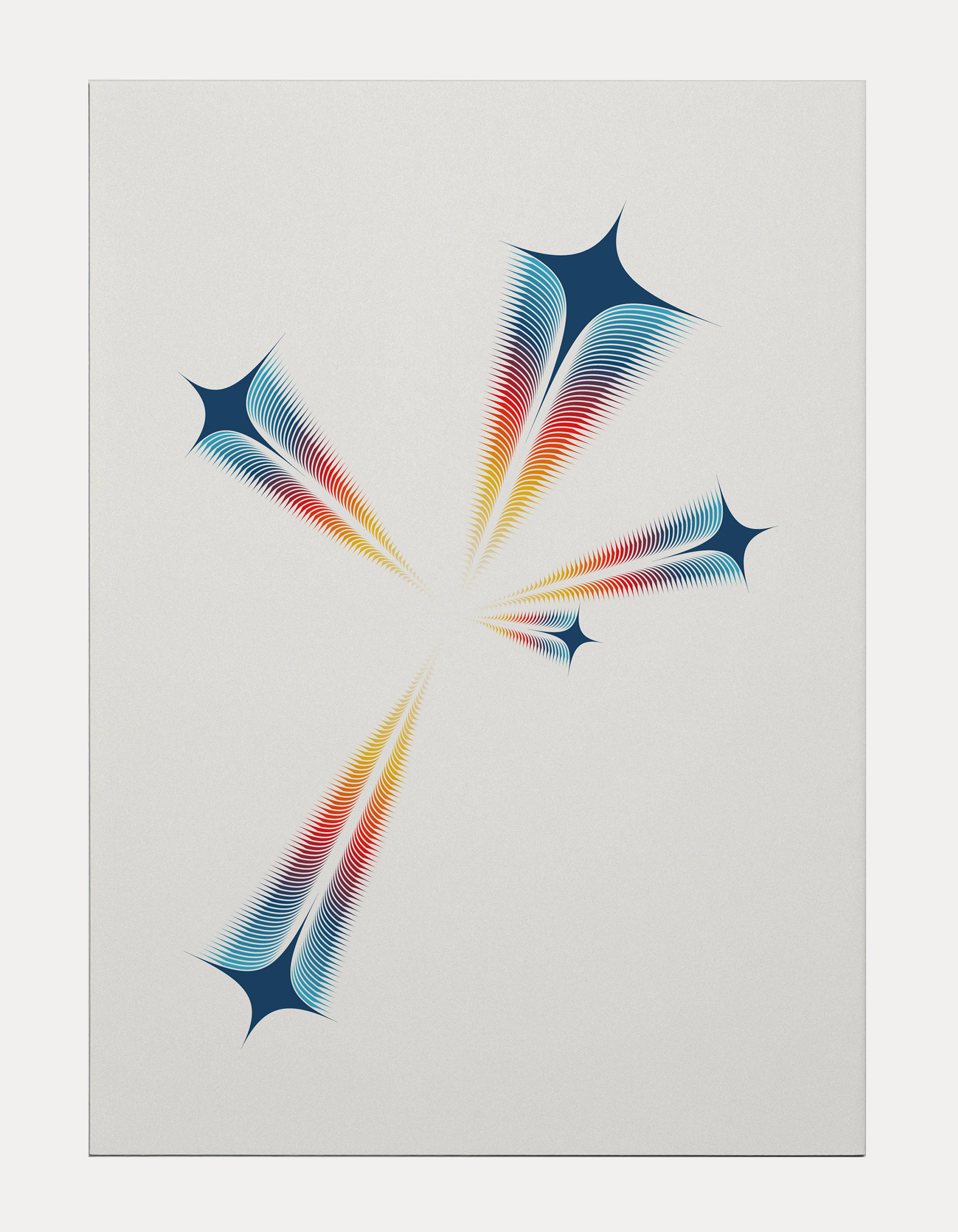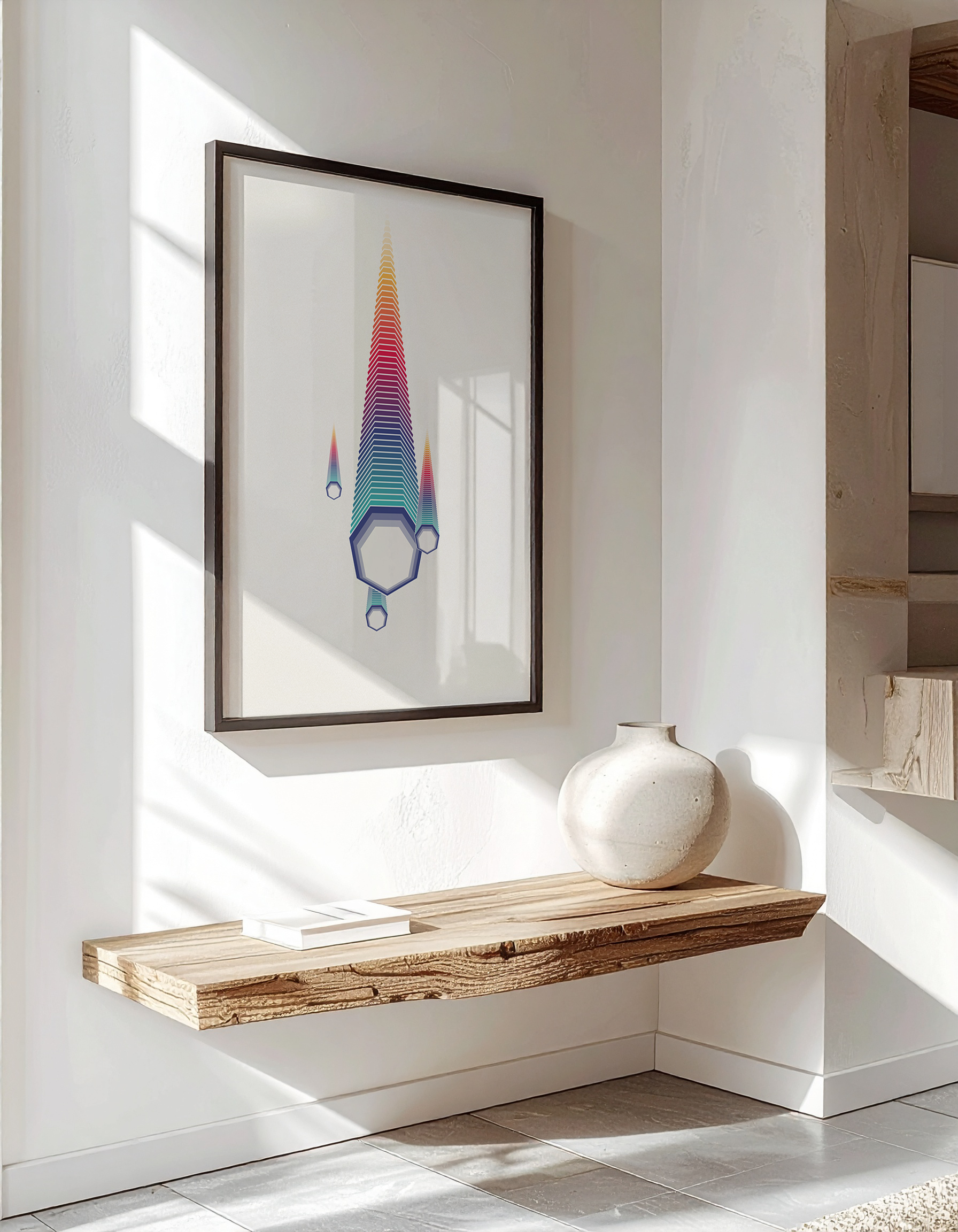 A dramatic shift in perspective, The Descent provides a close-up, impactful view of the catalyst for change. The Phoenix Egg - rendered here as a powerful, multi-layered geometric form - plummets from the heavens. Its vibrant, almost urgent, gradient of colour slicing through the quiet void symbolises the force of the artist's decision to embrace a new path. This piece captures the crucial, inevitable moment when the old life is broken by the potential of the new, setting the stage for the rebirth to come.